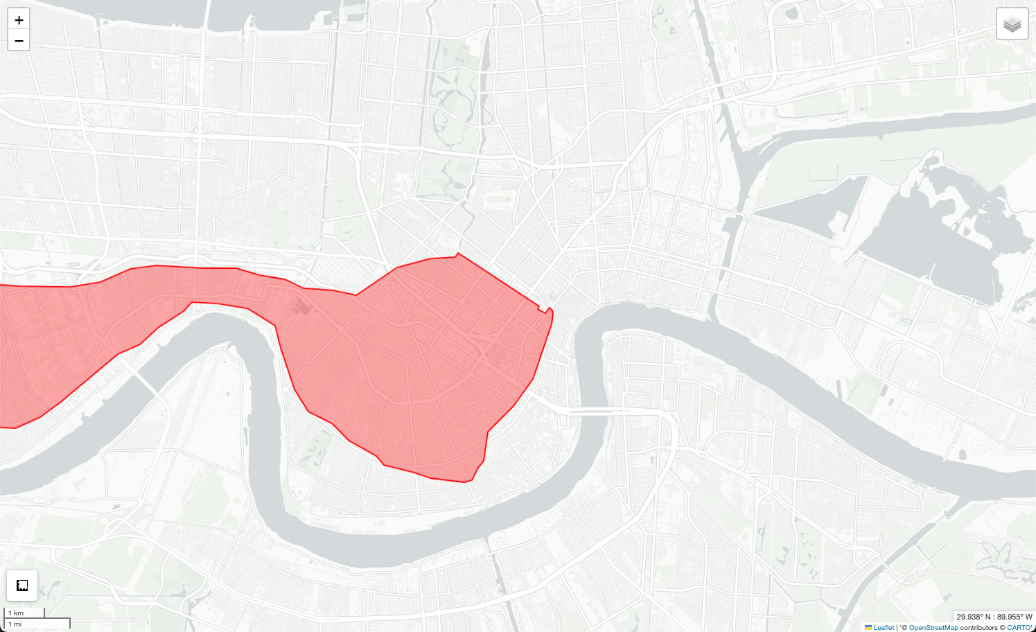 Of course, the flood covered a lot more than New Orleans itself because of where it began on the river, so the flood area looks like this: